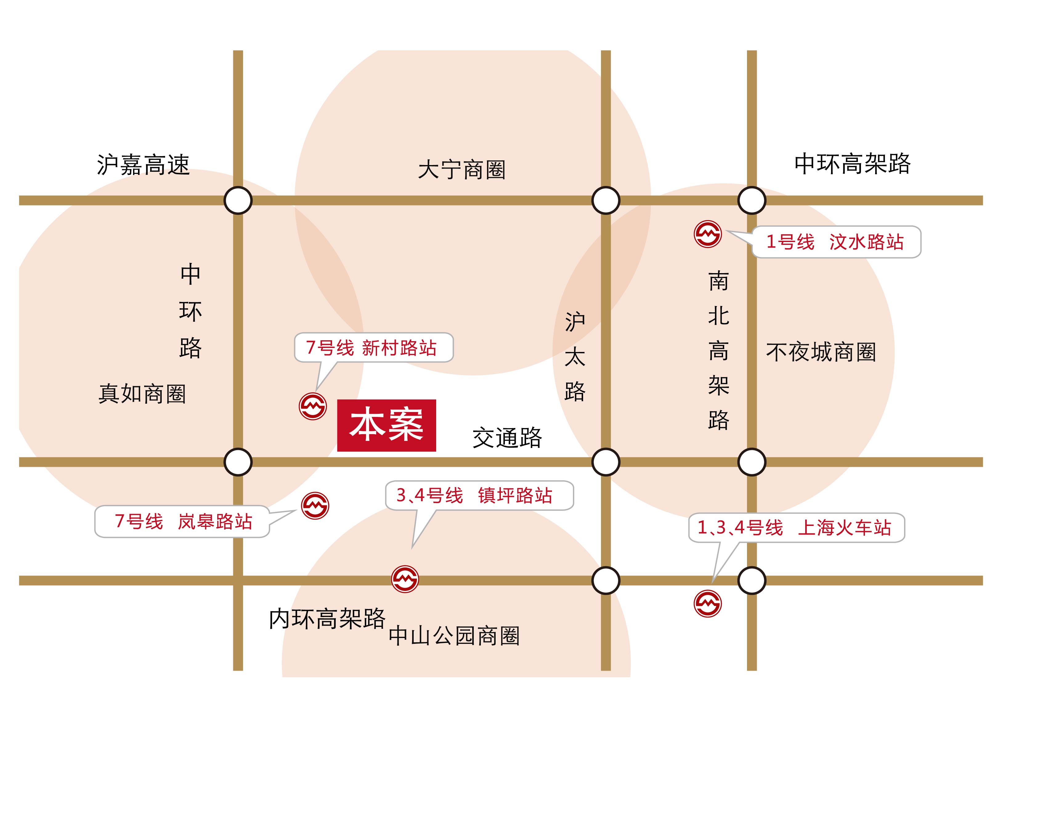 中国农业银行、中国民生银行、兴业银行、家乐福、上海西站、管弄公园、甘泉公园、真如古寺、同济医院、弘基时尚生活中心、百联中环购物广场、万丽酒店、百安居、天汇广场、卜蜂莲花、星巴克、联华超市