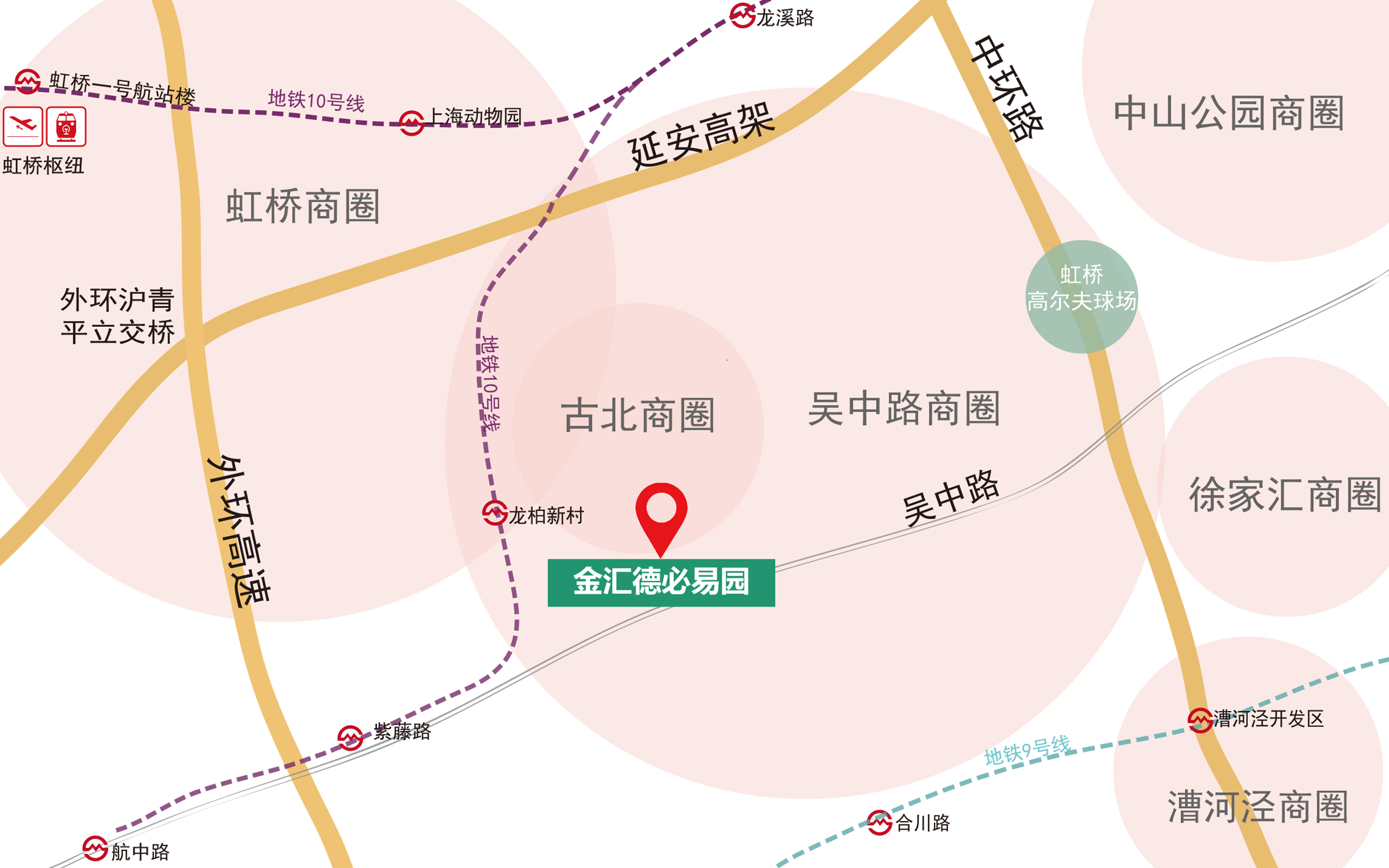 占据“长三角引擎、上海西大门”大虹桥核心地段,位于吴中路商圈中心,同时与徐家汇、古北、中山公园、七宝几大商圈聚合,形成了商圈团式分布、互相辐射的优势商务环境。