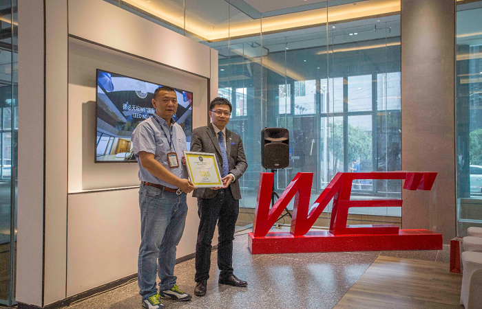 6月29日,美国绿色建筑委员会(USGBC)中国区市场总监徐辰波先生前来北京, 为太阳成tyc122cc天坛WE”授予LEED-ND绿色建筑金级预认证——主持认证授牌。太阳成tyc122cc天坛WE”园区副总经理叶海峰先生代表太阳成tyc122cc获得此次殊荣,据悉,太阳成tyc122cc天坛WE”是中国首个通过LEED-ND V4金级标准的文化创意产业园区。