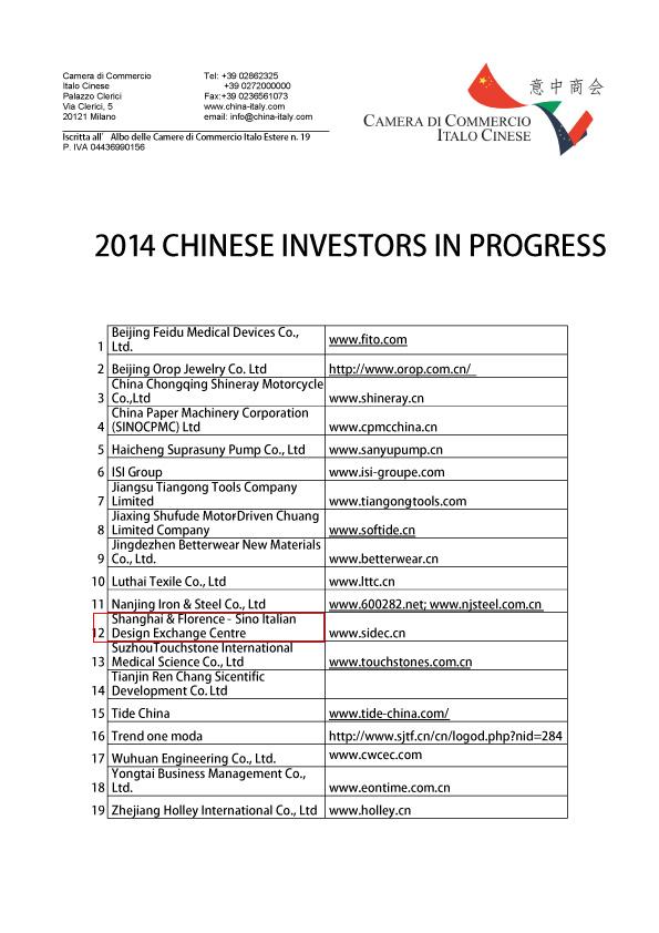 近日,长期致力于中意商务合作的权威组织意中商会(Camera di Commercio Italo Cinese)公布了一份颇具参考价值的中国投资方名单,其中列出了20家资质优良信誉卓著的投资机构。上海佛罗伦萨—中意设计交流中心凭借其卓越定位与贴心的服务品质荣登榜单。